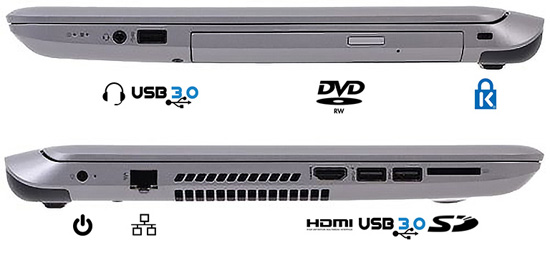 جالب است که با وجود بالا رده بودن دستگاه، این لپ‌تاپ از داشتن پورت‌هایی نظیر eSATA، Display Port، Thunderbolt و حتی VGA محروم است. شاید یکی از سیاست‌های HP این بوده تا برای خروجی‌های تصویر، کاربران بیشتر از پورت‌های HDMI و تکنولوژی‌های بی‌سیم مانند Intel’s Wireless Display استفاده کنند. بر لبه سمت چپ، سوکت ورودی برق دستگاه در کنار پورت شبکه گیگابیتی Ethernet که ماهرانه طراحی شده است، قرار دارد. خروجی هوای گرم سیستم خنک کننده دستگاه نیز در کنار پورت HDMI روی همین لبه تعبیه شده است. دو پورت USB 3.0 در کنار کارت‌خوان دستگاه نیز در این قسمت دستگاه قرار گرفته اند. لبه سمت راست میزبان قفل ضد سرقت Kensington، درایو نوری، یک پورت USB 3.0 دیگر و جک 3.5 میلی متری صدا است. در لبه عقبی و جلویی دستگاه هیچ گونه پورت یا اتصالی وجود ندارد. برای ارتباط بی‌سیم HP به درستی از چیپ شبکه بی‌سیم Intel Dual Band Wireless-AC 3160 استفاده کرده است که این چیپ از فرکانس‌های پایین تا Wi-Fi گیگابیتی با استاندارد 802.11 ac را پشتیبانی می‌کند. همچنین این چیپ دارای نسل چهارم بلوتوث نیز هست.